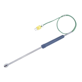 Temperature sensor suitable for measurement of flat surfaces in a temporary or permanent way.Sensor with handgrip has lead wire finished with miniature plug adequate for joining with portable temperature meter. max. temperature: +800°C