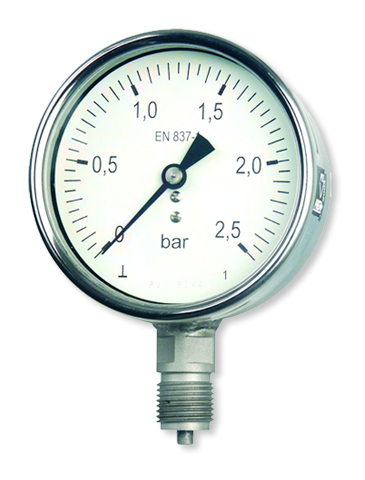 The fully stainless steel pressure gauge is designed to measure liquid and gaseous substances as well as aggressive media. Due to the materials used, the temperature of the medium can reach 200ºC. When using a liquid filling, the temperature drops to 100ºC. Resistant to dust, vapor or weather conditions.