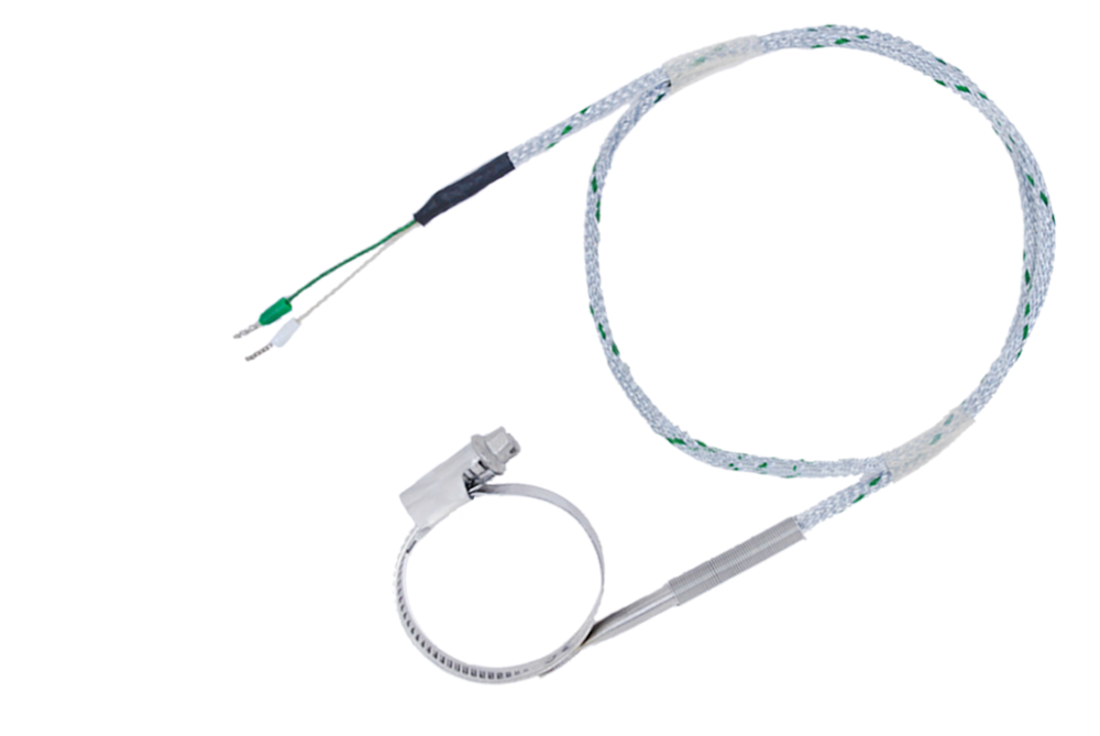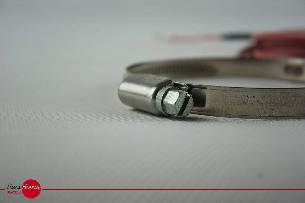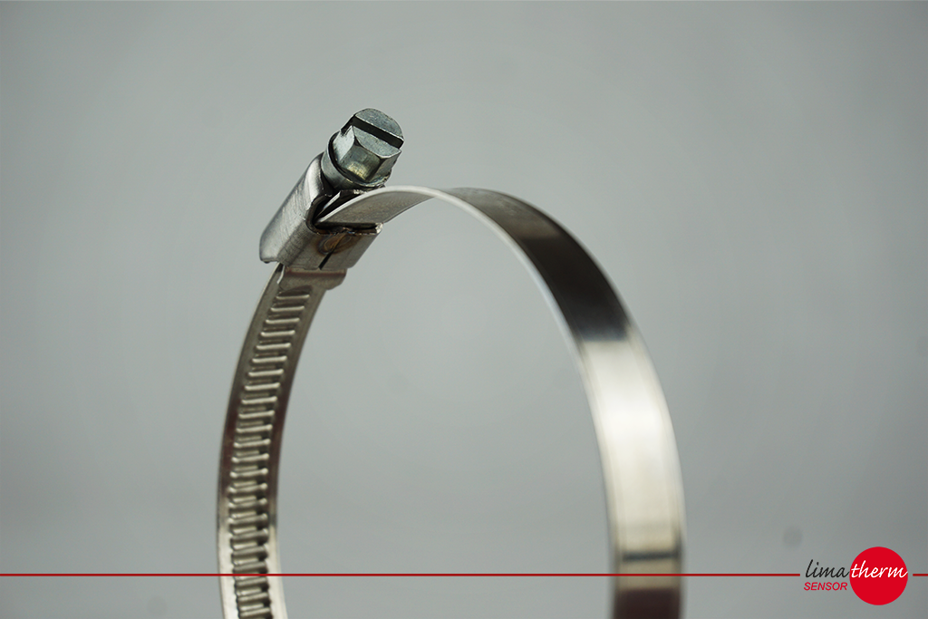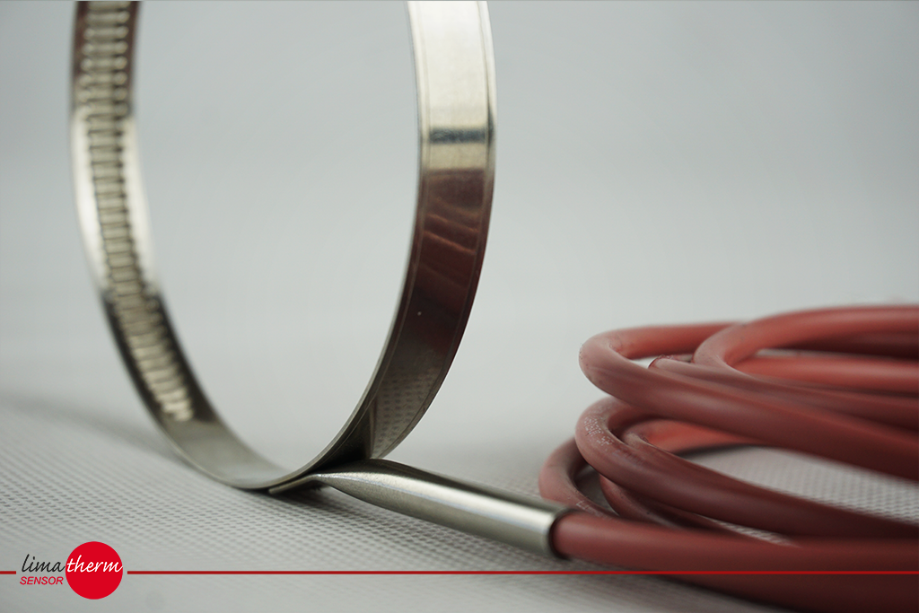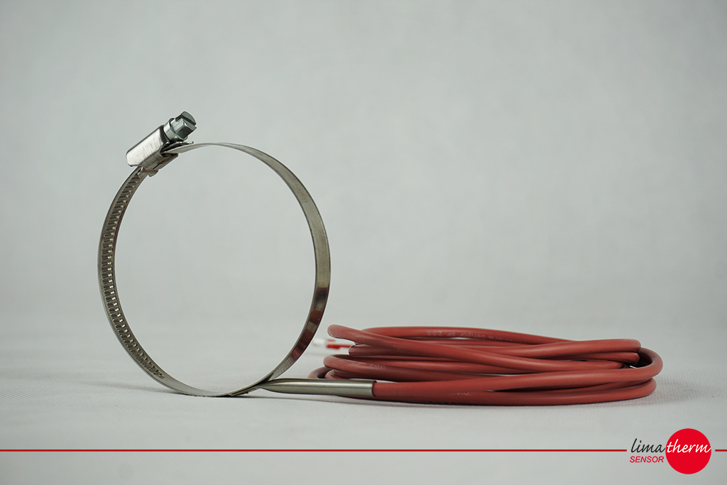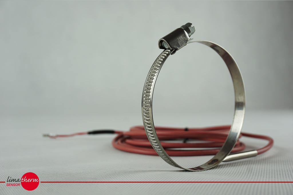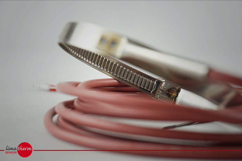 Temperature sensor with band clamp for measurement of pipes and shafts. The band clamp enables sensor installation on different types of pipes and shafts which are to be measured.
