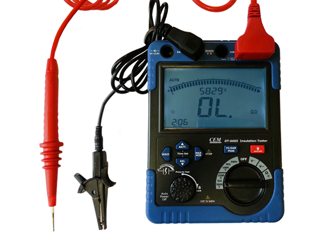 DT-6605 to profesjonalny miernik rezystancji izolacji z dużym wyświetlaczem i bargrafem. Miernik przeznaczony do pomiaru rezystancji do 60GΩ, z regulowanym napięciem probierczym do 5 kV.